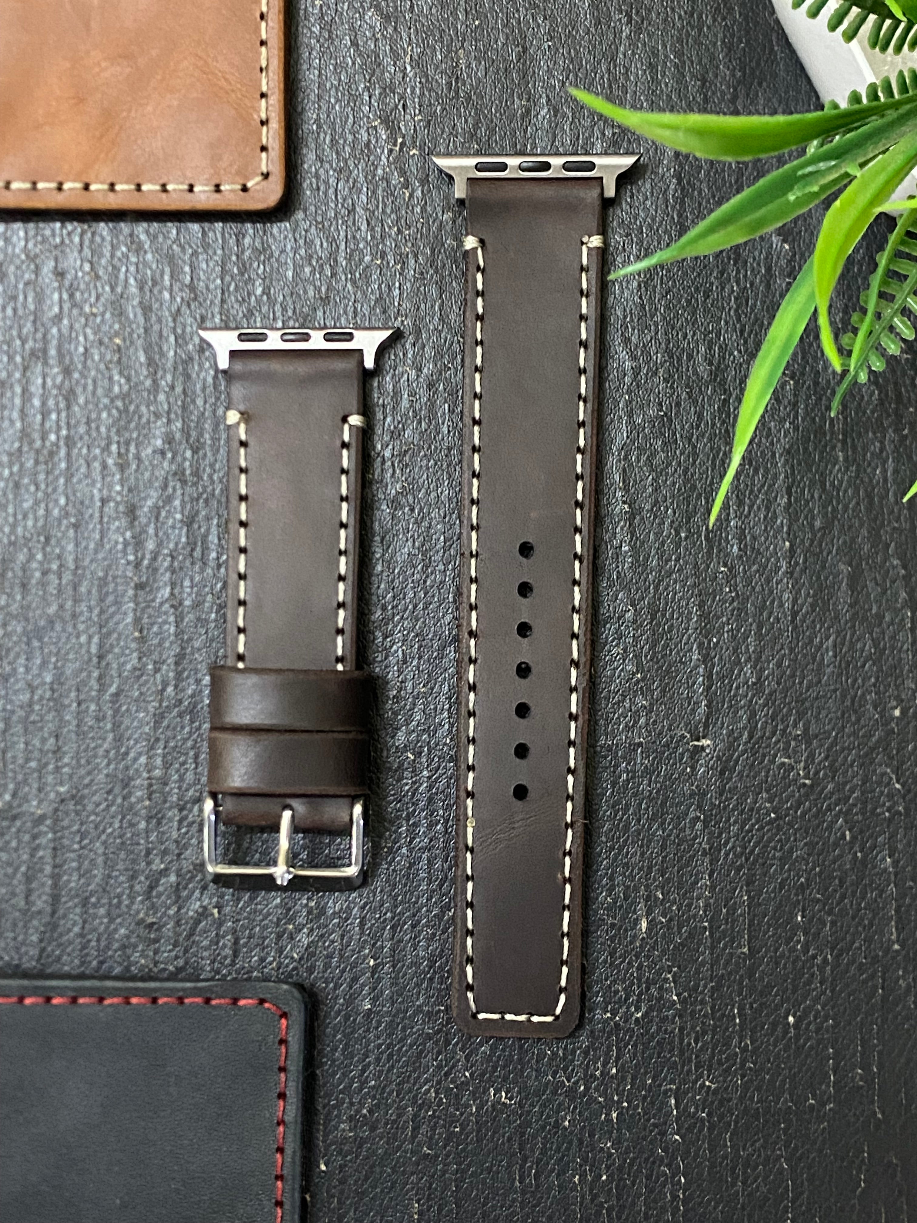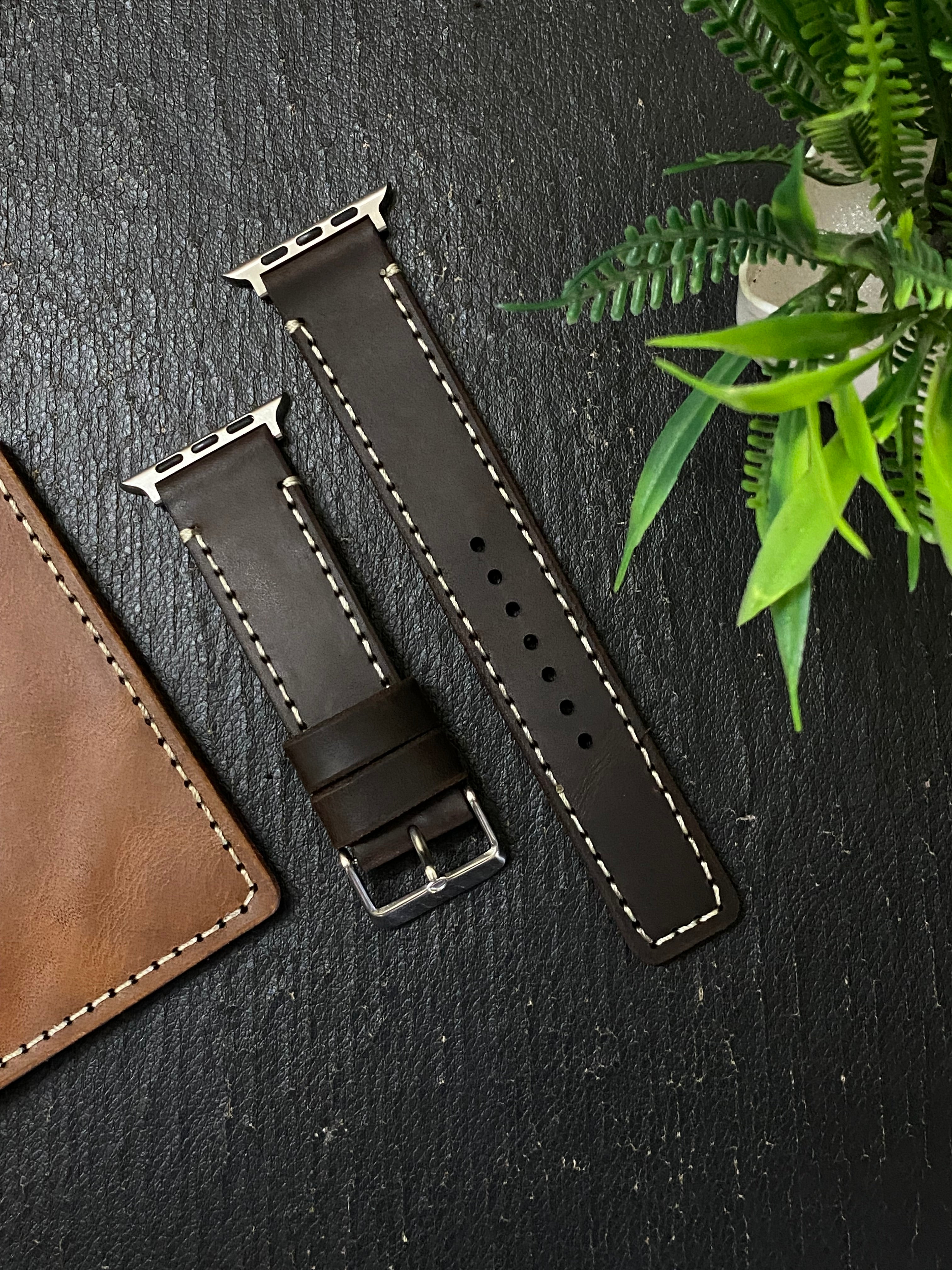 COMBO Darkest Brown Leather Strap Full Stitch Style Band for Apple Watch + Same Color Leather Wallet Handmade | ZINOSKINS